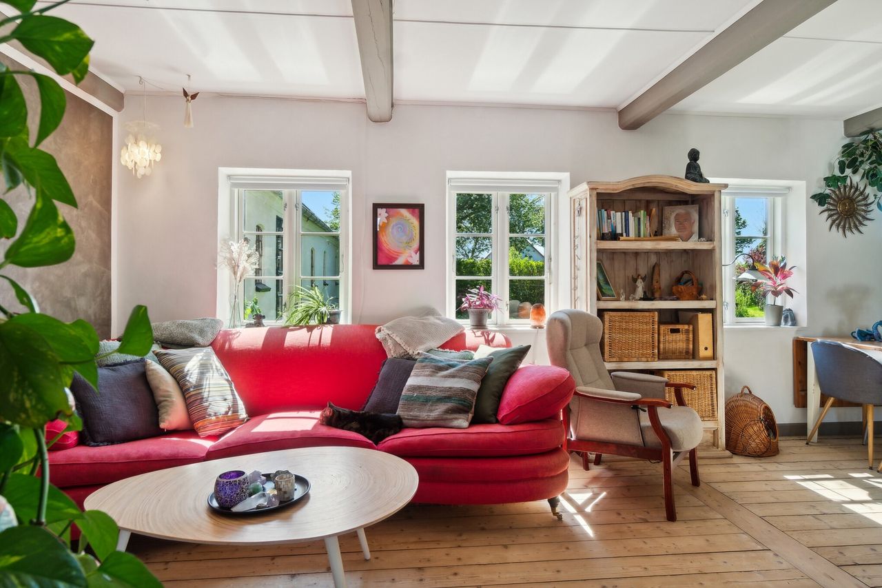 loftsrum. Stuen oser af hygge med en stor og flot masseovn centralt placeret, og de gamle plankegulve
