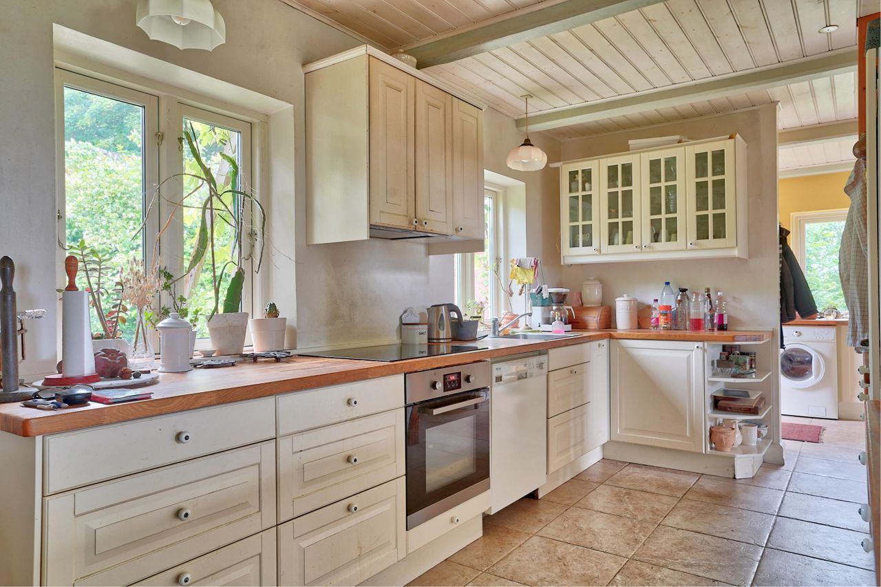 funktionelt køkken-alrum med stort landkøkken i åben forbindelse med stue, et lille værelse og